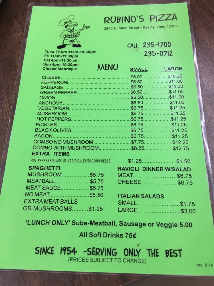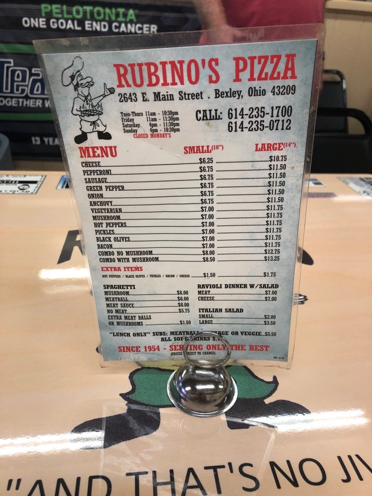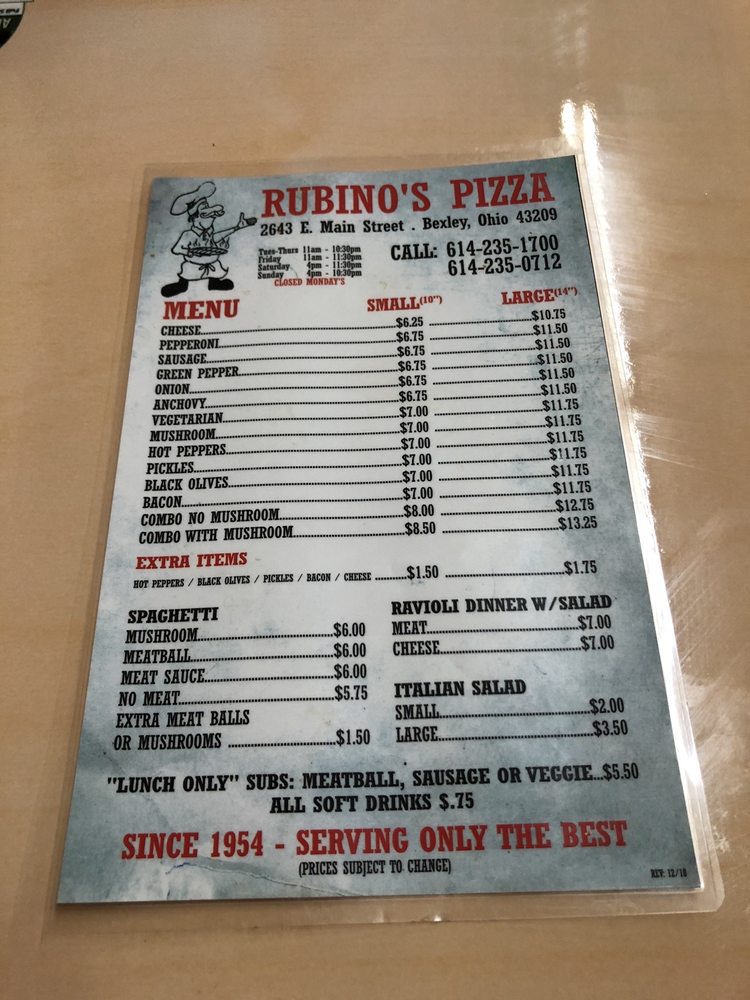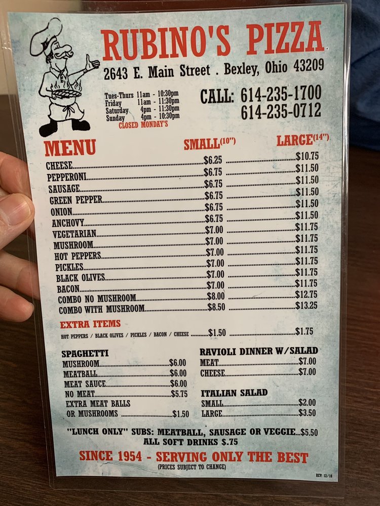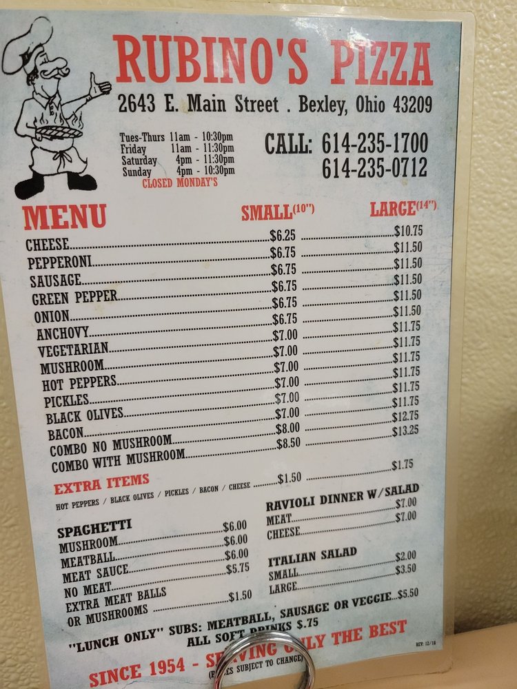 Rubino's Pizza is a veteran-owned restaurant in Columbus, Ohio, offering a variety of classic pizzas and pasta dishes. With a diverse menu featuring options like pepperoni, sausage, vegetarian, and combo pizzas, as well as spaghetti with meatballs or meat sauce, there is something for everyone to enjoy. Customers rave about the delicious thin crust pizzas, generous toppings, and friendly service. The atmosphere at Rubino's is described as nostalgic and welcoming, with a retro 1950s-style diner feel. Despite being a cash-only establishment, the affordable prices and tasty offerings make it a popular choice among locals. Whether you're looking to dine-in or grab takeout, Rubino's Pizza is a must-visit for a taste of authentic, old-school pizzeria goodness.